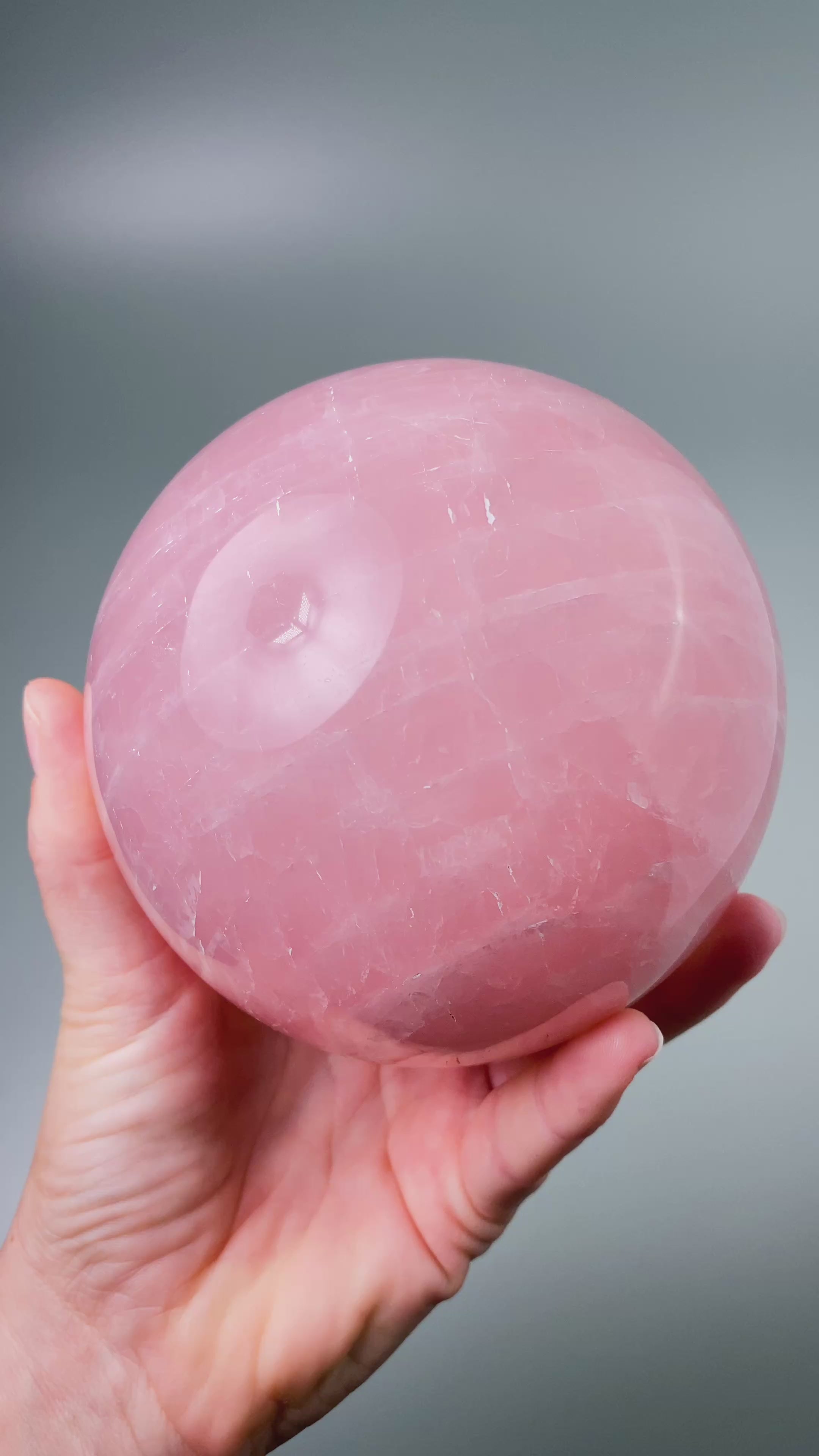 Kærlighedsstenen poleret til en smuk kugle. Kaldes også Rosenkvarts. Den giver en guddommelig kærlighedsenergi, skaber stabilitet og er beroligende. Den giver balance i yin og yang, og er en af de krystaller alle bør have i deres samling fordi den afbalancerer hjertecentret. Dens vibrationer er blide og kærlige, og den opsuger negative energier. Den giver os ro og hjælper os til at tilgive.